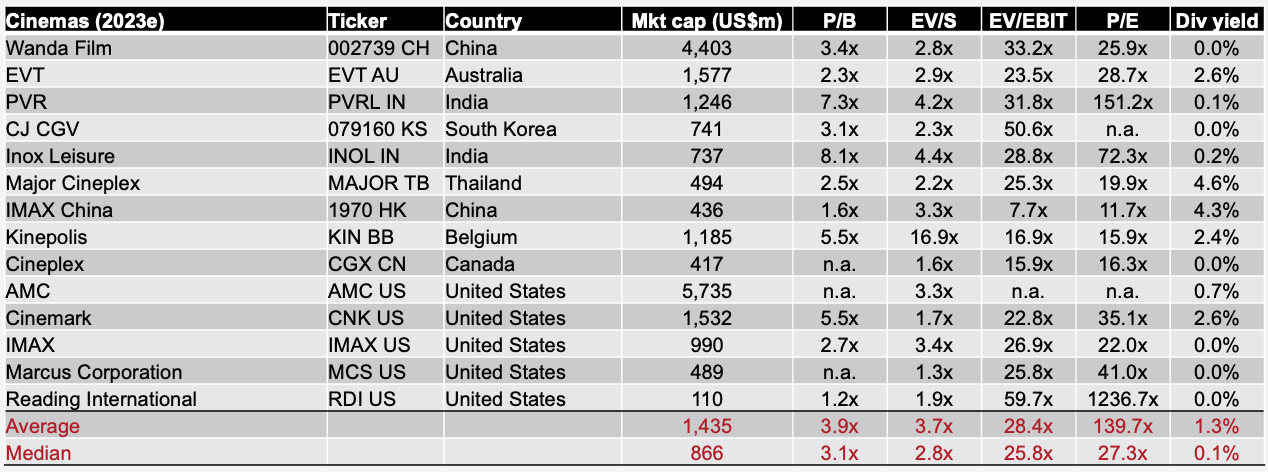 In the United States, Cinemark (CNK US - US$1.5 billion) has seen its enterprise value drop significantly since the start of COVID-19. However, that’s partly due to the company’s LatAm exposure and weakening currencies in those countries. It’s hard to judge exactly what a normalised multiple will be, given significant currency movements. But in my view, it should end up somewhere around 6-7x EBITDA.