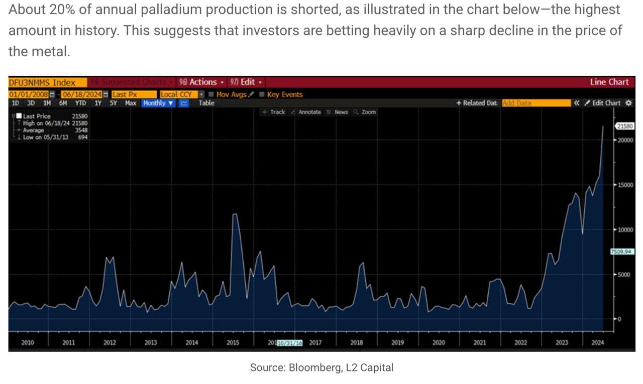 Palladium is also out of favor. Marcelo Lopez reports that 20% of annual palladium production is shorted, making it one of the most shorted metals in the world. The EV narrative has investors betting on a secular decline in palladium prices.