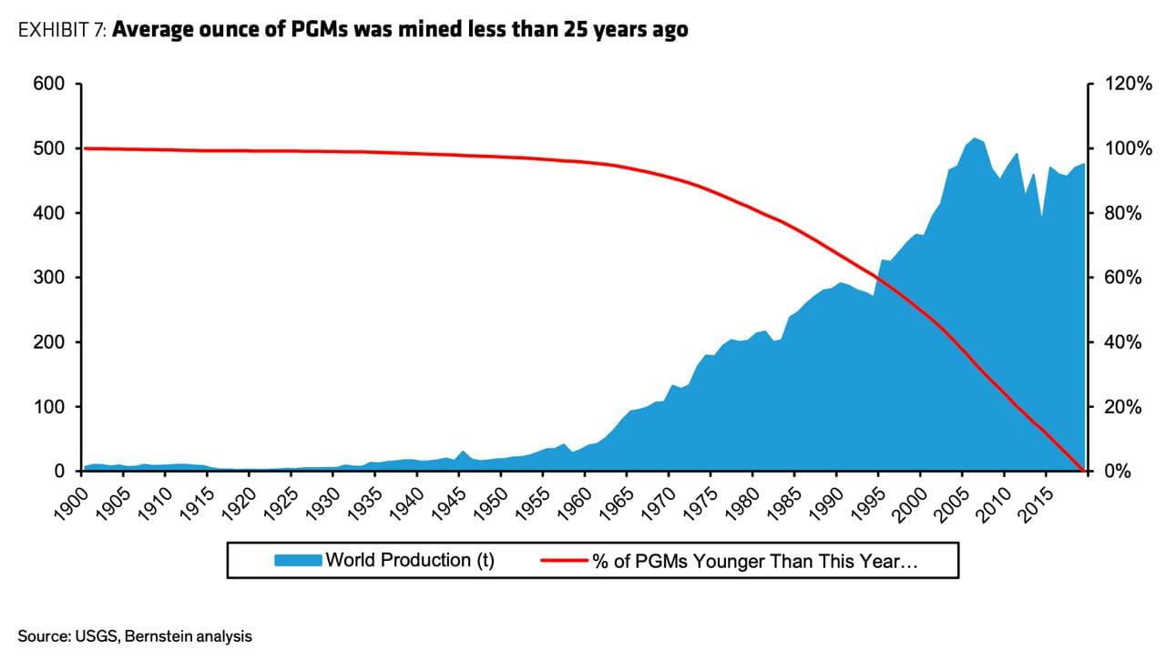 The catalytic converter was the “killer app” that caused demand for the PGMs to skyrocket. Since the 1950s, production has gone up in pretty much a straight line: