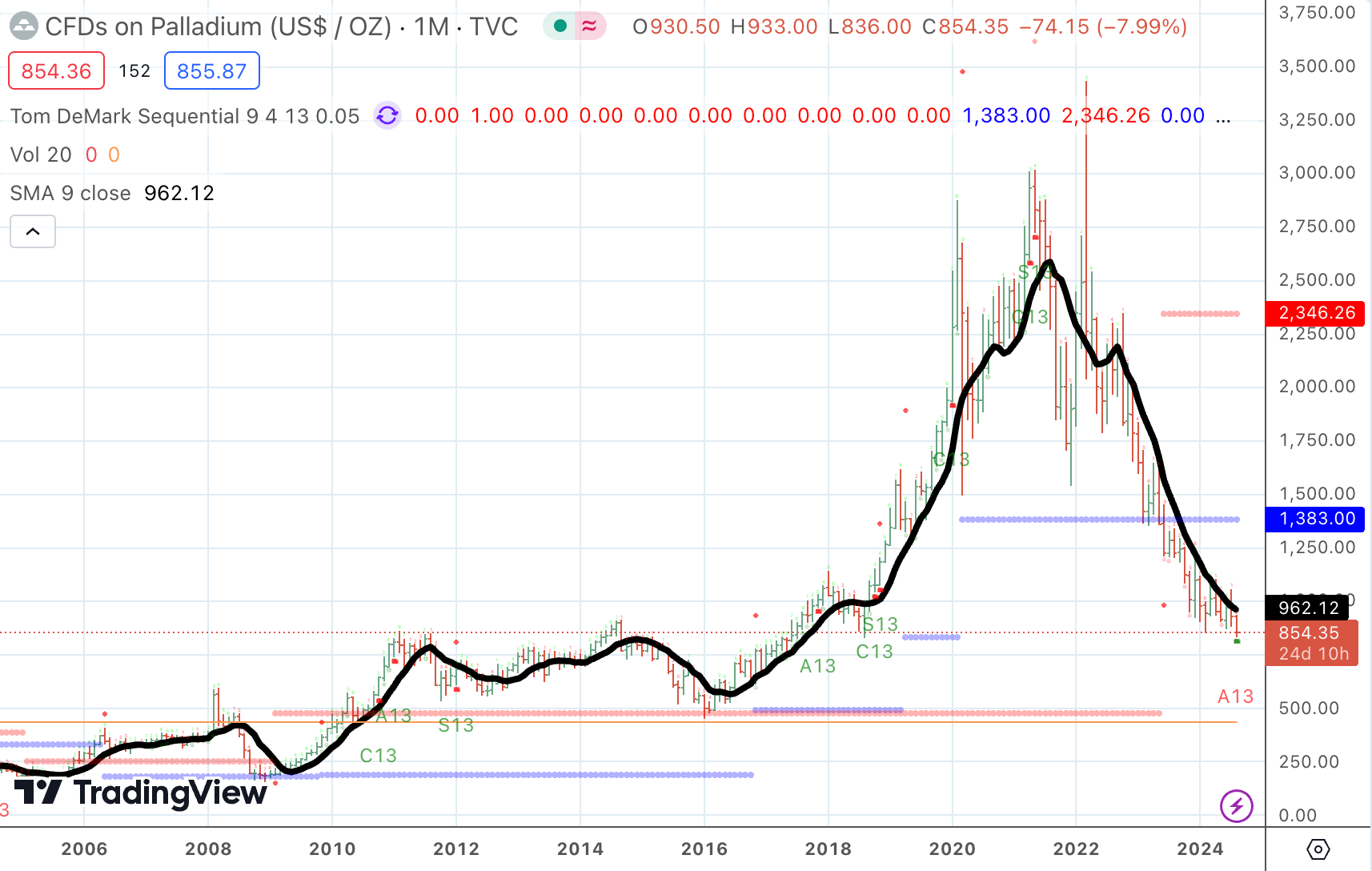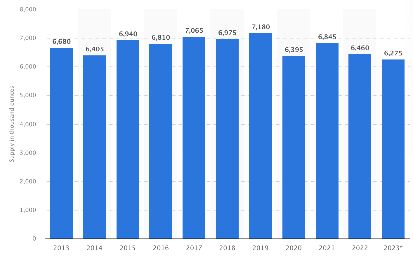 The decline in production is also seen for Palladium, whose supply has been flat to down in the past decade to about 6 million ounces.