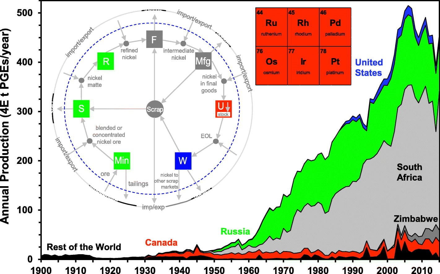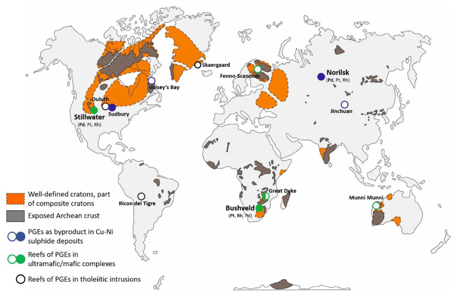 Almost 90% of platinum group metals come from South Africa, Zimbabwe and Russia. In South Africa, you have the Bushveld complex with deposits that are over 2 billion years old. Then you have the Great Dike in Zimbabwe. Finally, you have the Norilsk PGM deposits in Siberia, whose palladium is mined as a by-product of nickel. While there are also promising deposits in Canada and Australia, production from these remains small.