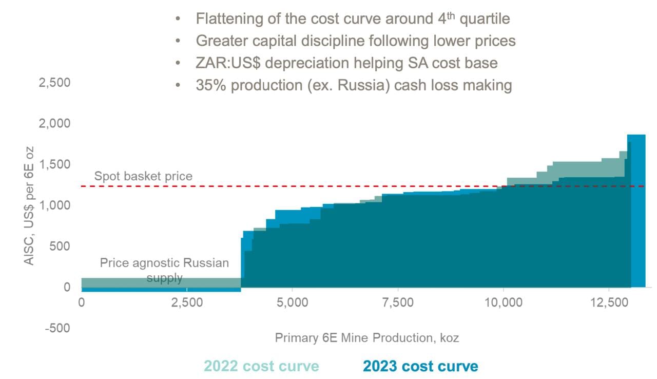 The cost curve for platinum group metals suggests that prices above US$1,500 per ounce are around the 12 million mark. From my understanding, the total production number includes all 6E PGMs. That compares to a platinum price of US$944/ounce currently and a palladium price of US$851/ounce.