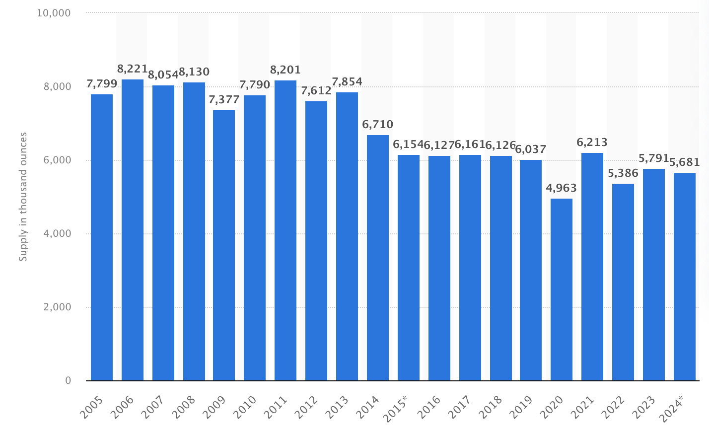 As you can tell, production has gone up over time. But in the past ten years, world platinum production has been declining from around 8 million ounces in 2011 to less than 6 million ounces in 2024. From my understanding, the cuts have mostly taken place in South Africa. You might want to adjust for recycled platinum as well, but even this number has dropped due to lengthening replacement cycles for autos.