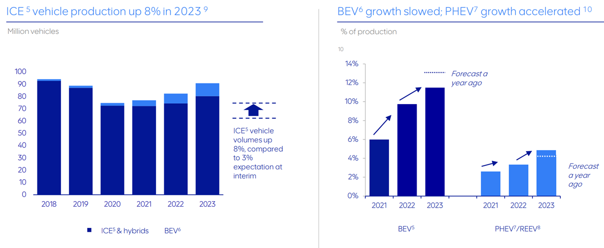Still, the following chart from Anglo American shows that the sum of gasoline vehicles and hybrids sold rose by +8% in 2023 and is likely to rise further. Meanwhile, sales of hybrids are beating expectations.