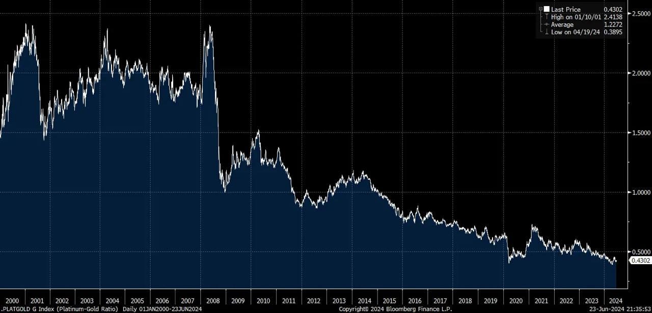 Since 1900, due to its scarcity, platinum has on average traded at almost twice the price of gold. But today, that number has shifted to an almost 60% discount to gold per ounce.
