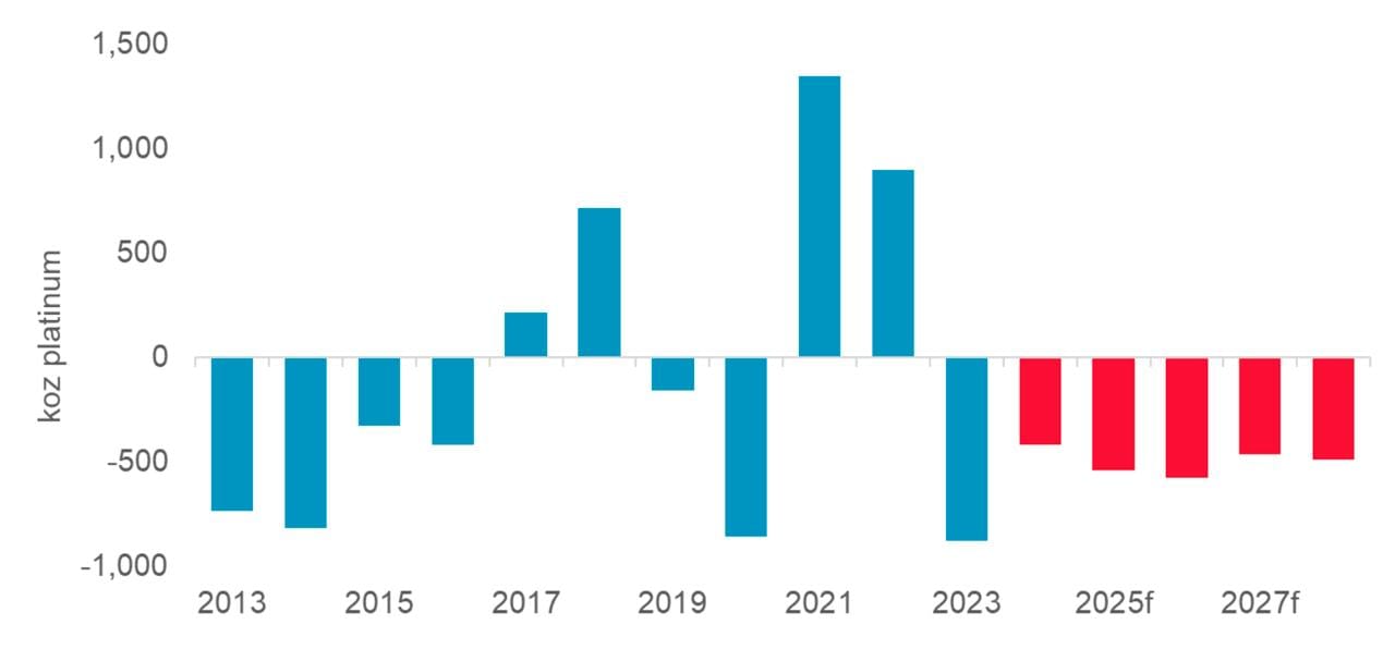 The supply of palladium is expected to be less tight, with a deficit of 1.3 million ounces this year but then flip into a surplus in 2026. Inventories aren’t nearly as tight as for platinum.