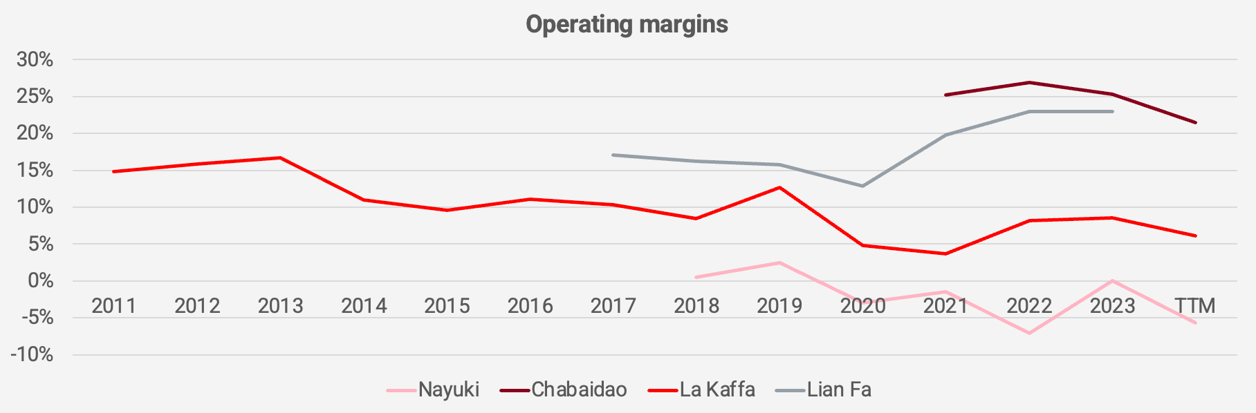 The operating margin profile suggests that Chabaidao is an outperformer. This is no doubt because of Chabaidao’s higher exposure to its franchisee operation. La Kaffa’s declining margins suggests increasing competition in the sector.
