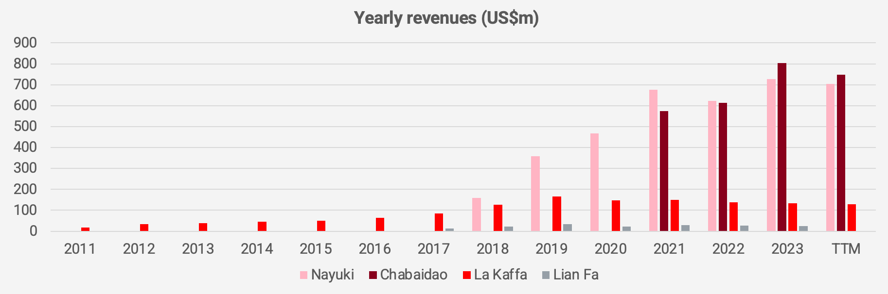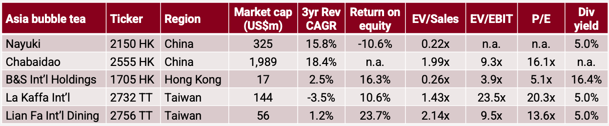 Reported revenues have also slowed recently. La Kaffa has shrunk its turnover since 2019, and Lian Fa isn’t growing either. Nayuki’s and Chabaidao’s revenue growth seems to be decelerating, too, after reports of intensifying competition in Mainland China.