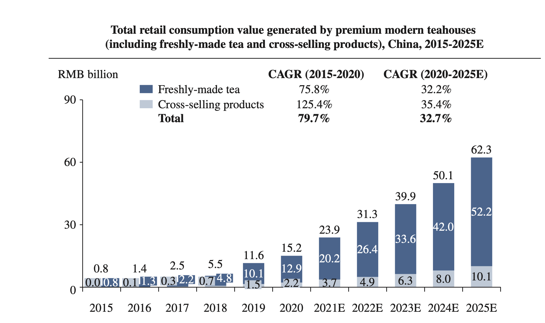 In sales numbers, the freshly-made tea segment made up roughly 64% of the CNY 380 billion beverage shop industry. And the tea sub-segment has apparently been growing at a 25% CAGR since 2018.