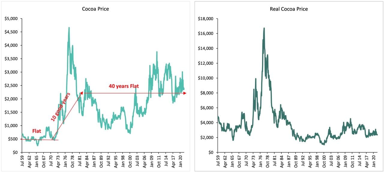 This story has played out before. There was a massive boom in cocoa prices in the 1970s and another spike in 2008. The latter led to a decline in margins for the chocolate manufacturers, and it took them roughly four years to recover from it. Though even if prices drop, chocolate manufacturers hedge cocoa costs 2-3 years out, so the effect from the cycle tends to be lagged.