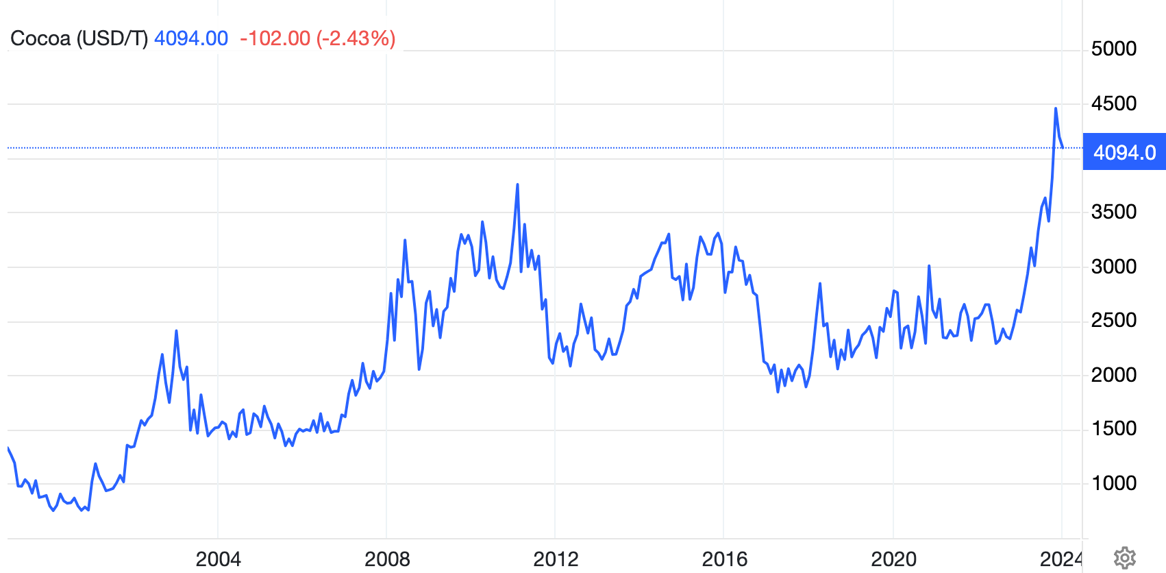 What typically happens when you see such price spikes is that farmers respond by planting more trees. ICCO estimates that a 10% increase in farmer prices on average leads to +0.6% higher supply in the same year year. Given global cocoa production of 4,938 tons per year and a deficit of 116 tons - a 2.3% deficit - it’s not difficult to see that the current high prices could encourage enough supply to bring the market back to balance again, even within 12 months.