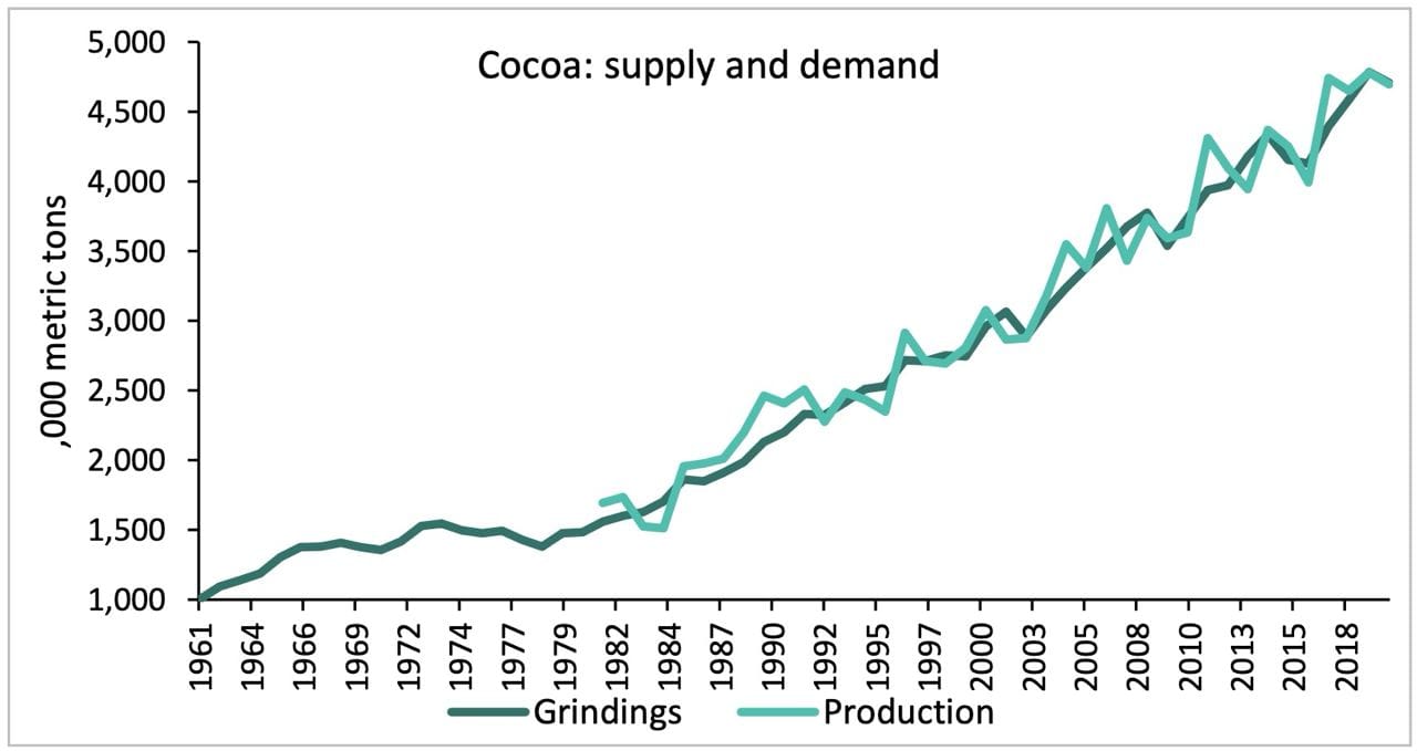 Over the past sixty years, cocoa consumption has grown at an average rate of about 2.5% per year. There’s been remarkably little variation, growing across almost all consecutive three-year periods. The chart below shows grindings (demand) measured in thousands of tons vs. a much more volatile production (supply).