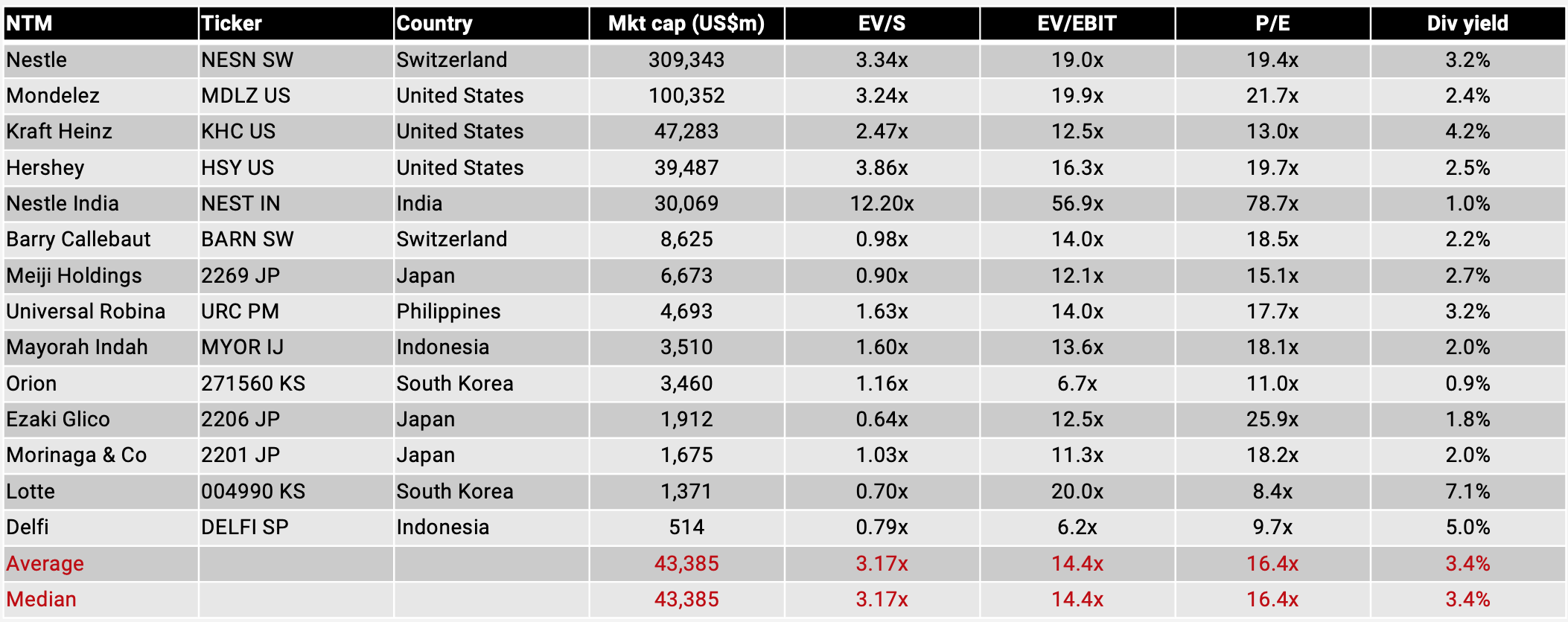 Most chocolate manufacturers trade at P/E multiples in the mid-teens, with some Asian names like as Delfi and Orion significantly below the average, despite lower exposure to markets where Ozempic is popular, and despite better underlying growth.