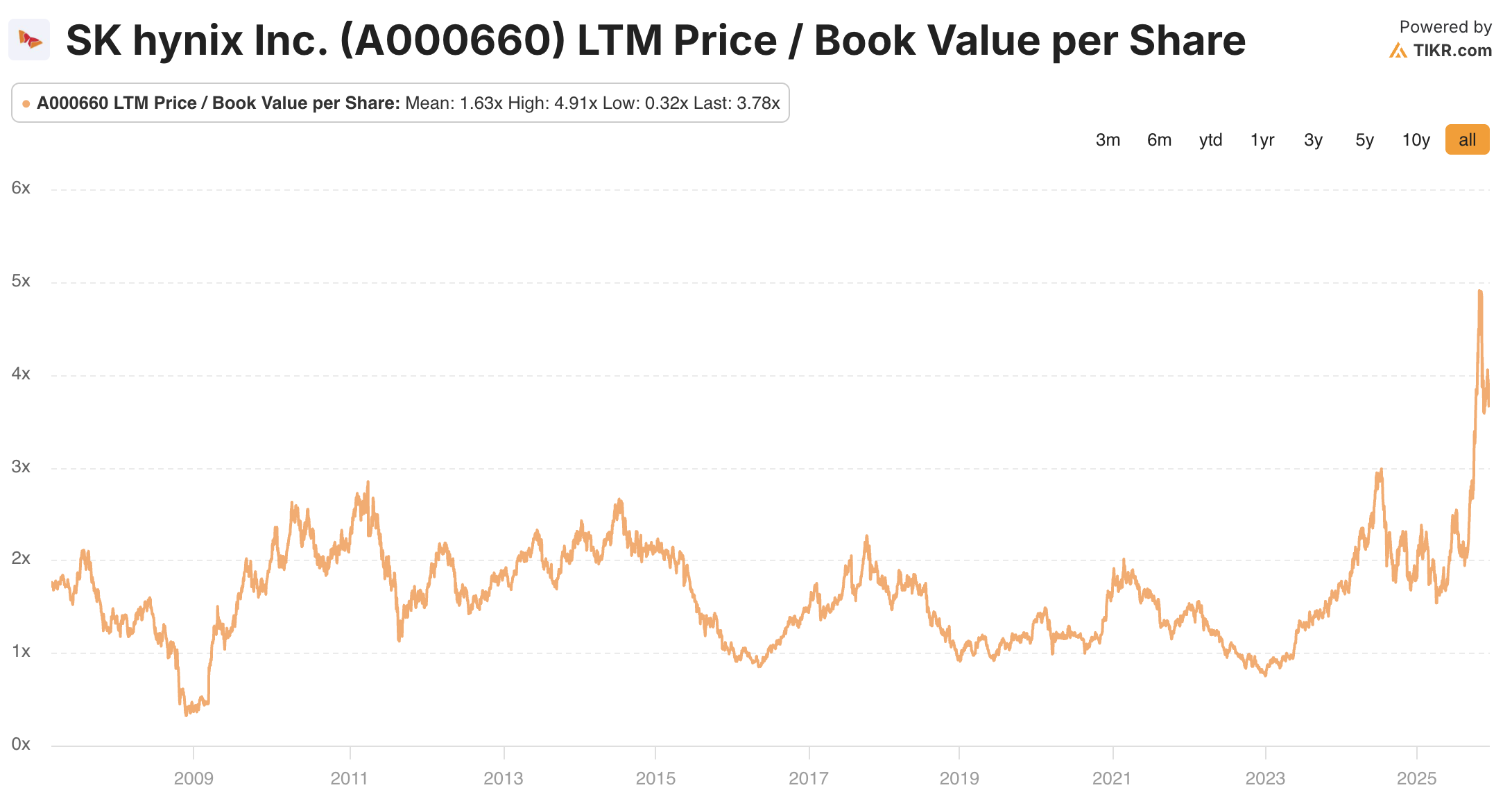 Meanwhile, the big three memory chip makers, Micron, SK Hynix, and Samsung Electronics, now trade at elevated Price/Book valuations: