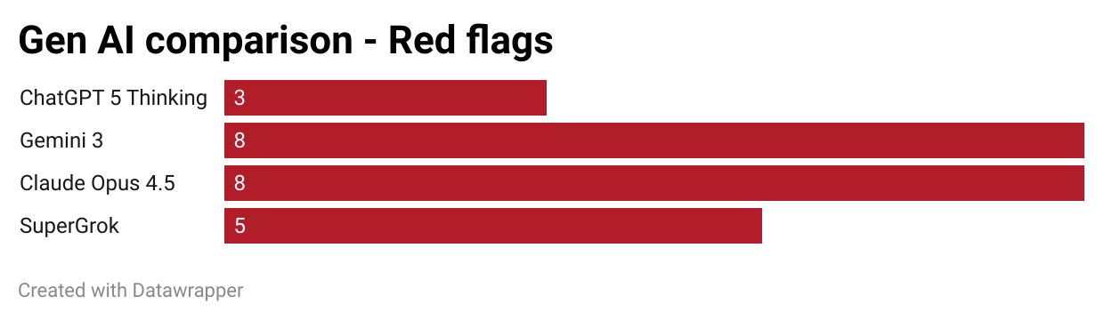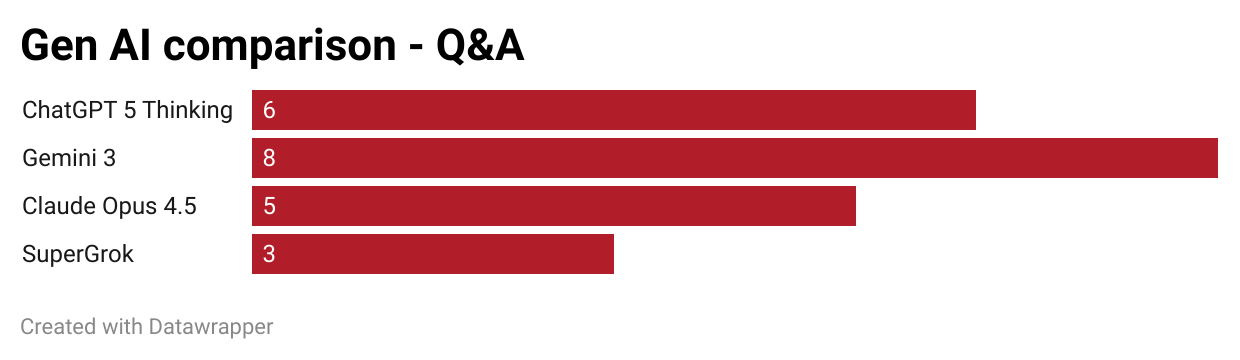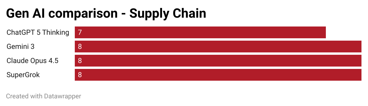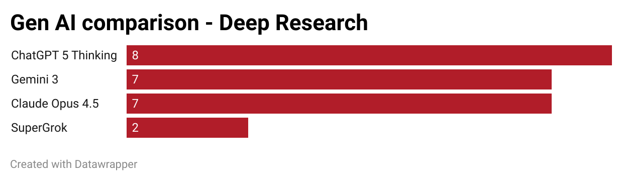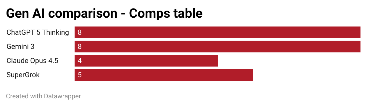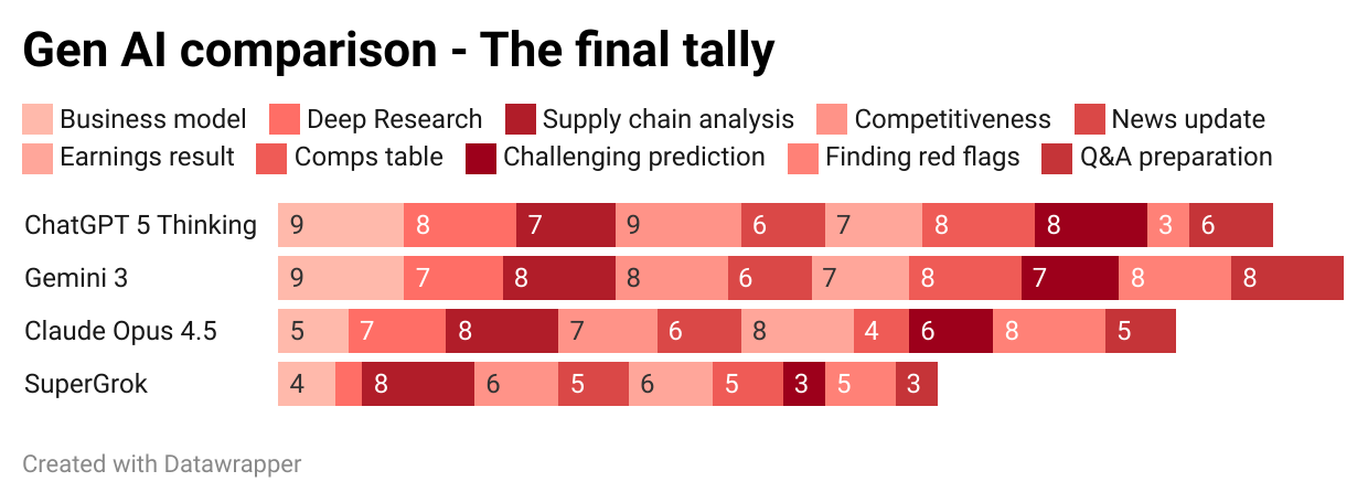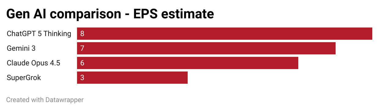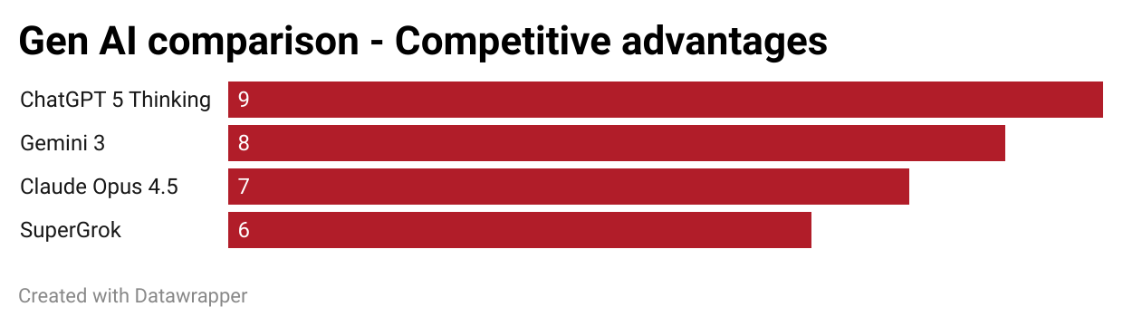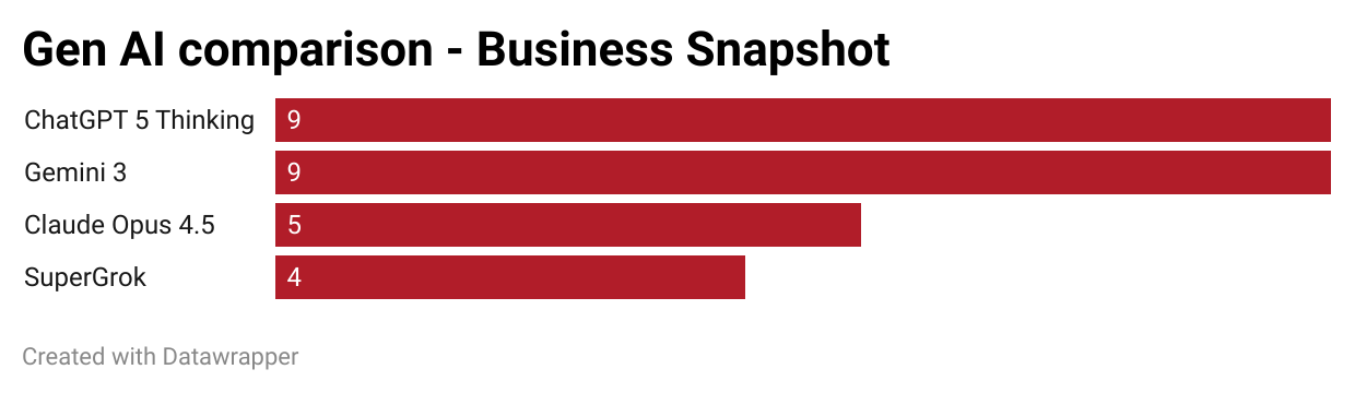 So with Gemini 3, I think it's finally competitive against ChatGPT. Claude has improved, but is lacking in terms of data analysis and its nuance. SuperGrok remains far behind.