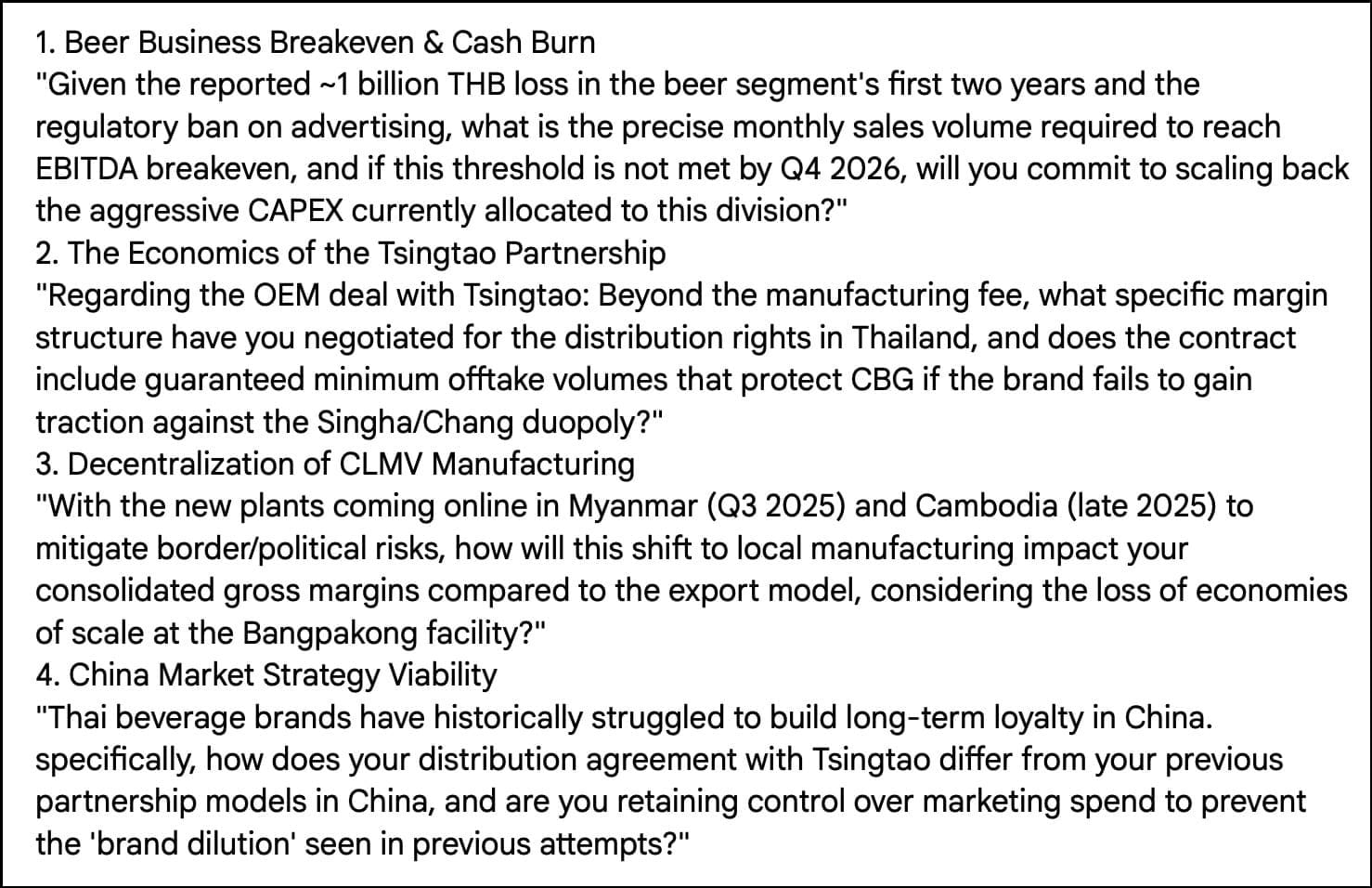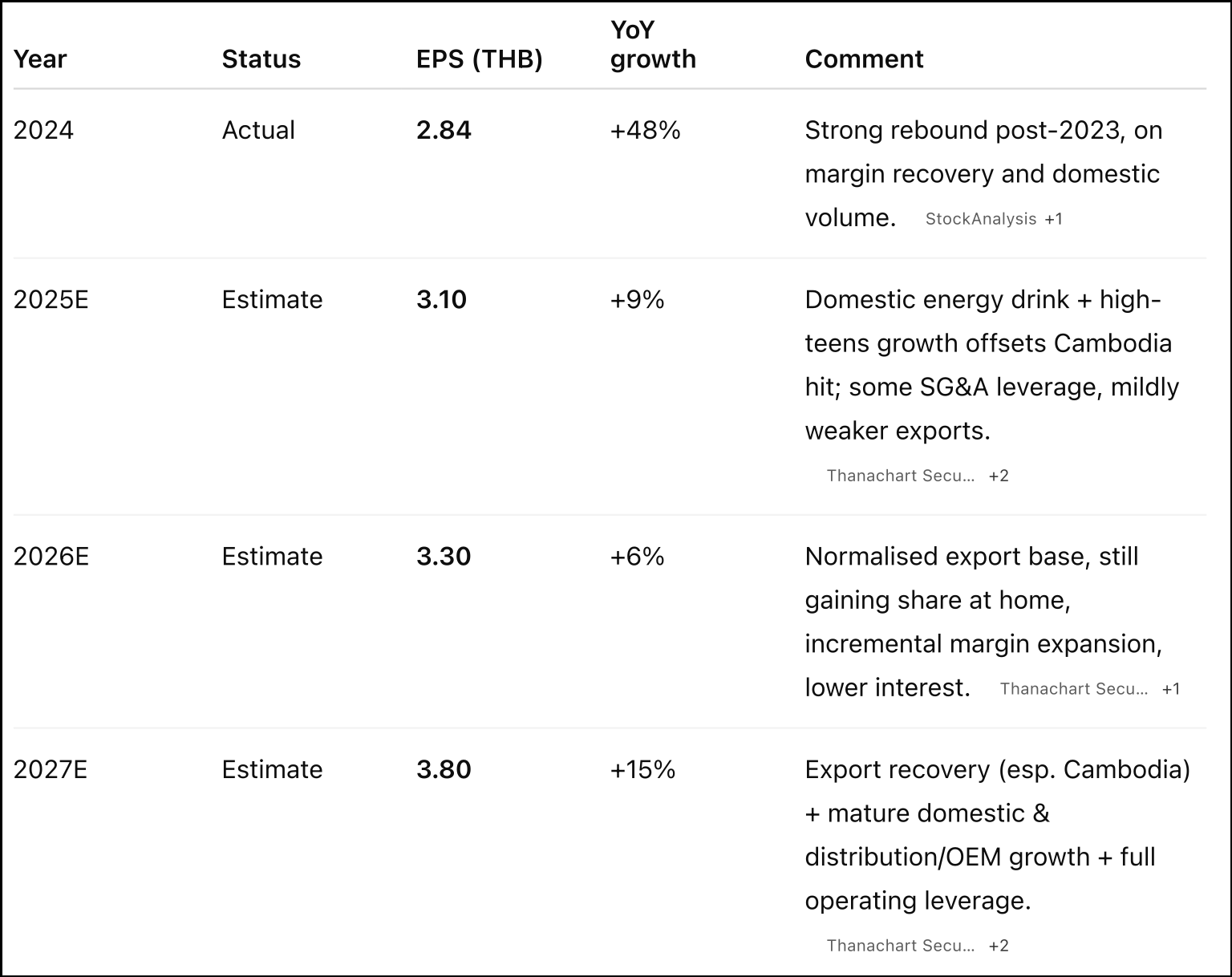ChatGPT correctly identifies the positive effect from the factory ramp-up in the next six months. Gemini 3's forecast now takes that factor into effect as well, though I think it might be underestimating the margin recovery story. I think Grok's forecast is unimpressive, assuming price increases despite the almost-fixed THB 10 price point and using global beverage sales growth as a guide. Claude 4.5's estimates are somewhat better but don't seem to consider the new factory in Cambodia. So ChatGPT wins this one, again: