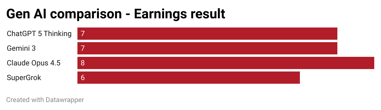ChatGPT's answers are long and extensive, but somehow missed the fact that Carabao signed a strategic partnership agreement with Tsingtao Brewery in September this year. I also think it underplayed the sugar tax rise on 1 April 2025. Gemini 3's answer was easy to read and provided a great summary, but also missed the Tsingtao Brewery agreement. Claude 4.5's answer was significantly better than the previous model's, and included information about the Tsingtao Brewery agreement as well as M-150's early 2025 market share gains. However, it did not contain any information about Carabao's Q2 and Q3 earnings. Grok's answer was in chronological order, a bit wordy and also missed several key facts, including that founder and CEO Sathien Sathientham bought shares in Carabao recently. In my view, neither model performed particularly well on this task: