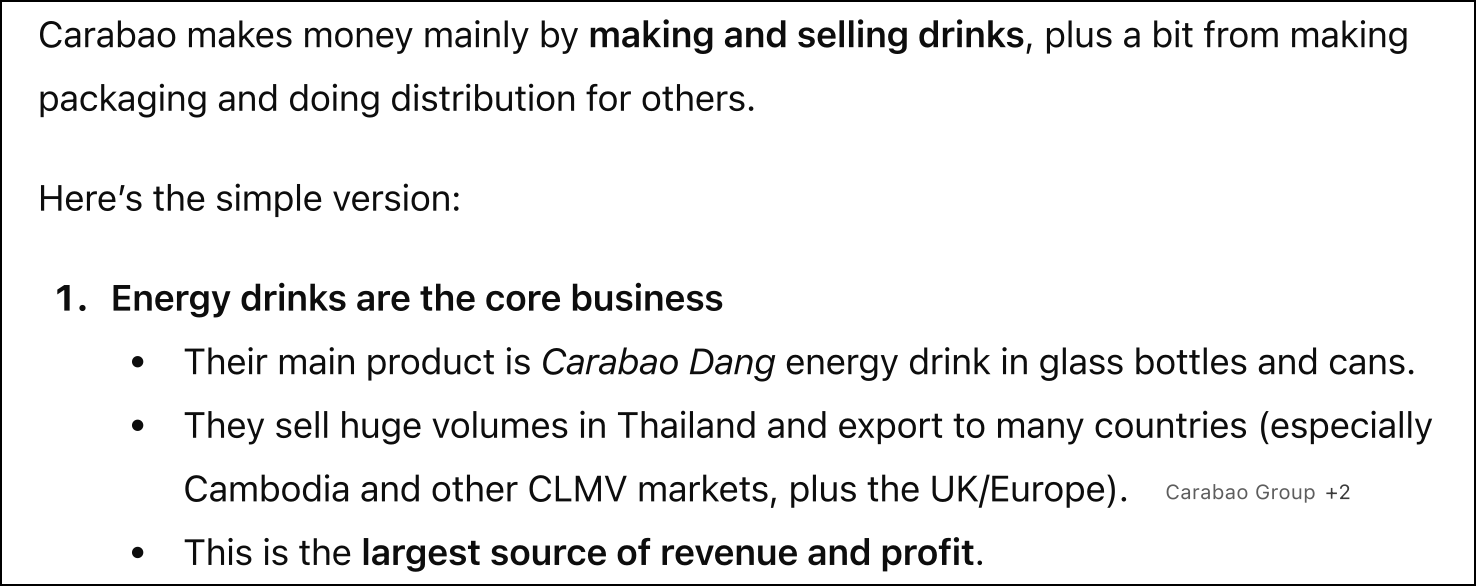 I think ChatGPT's answer is excellent. We learn that Carabao is a Thai beverage company focusing primarily on energy drinks, but also sports drinks and vitamin drinks. Furthermore, ChatGPT tells us that it's a vertically integrated operation and that it also sells to neighbouring countries like Cambodia and Vietnam. My only issue with ChatGPT's answer is that it doesn't mention that Carabao also sells beer on behalf of a related party.