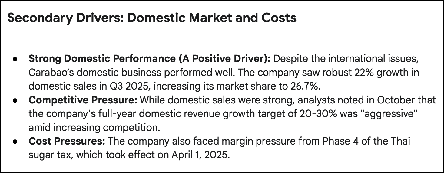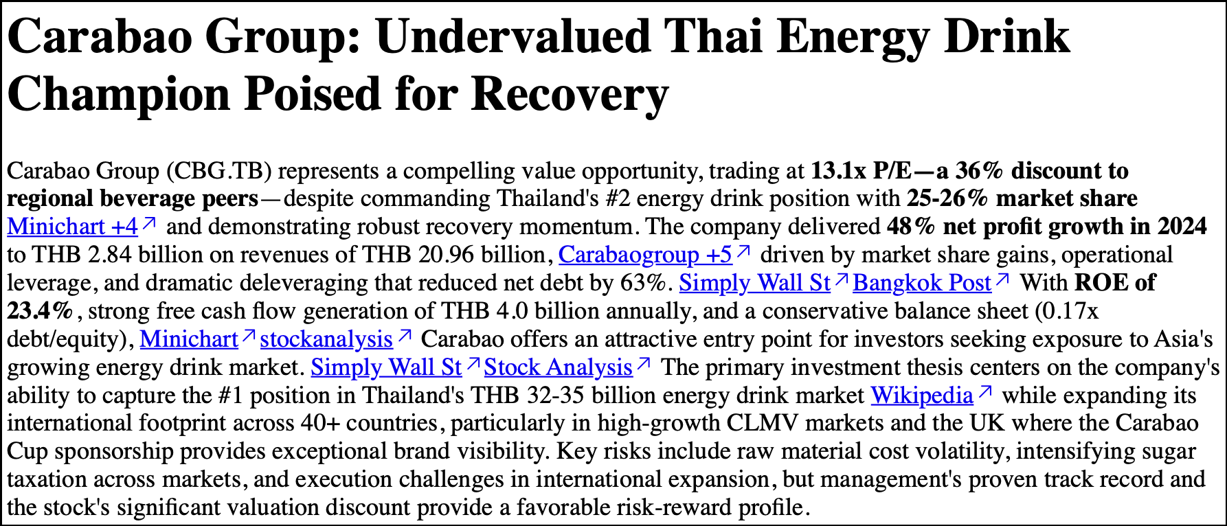 The ChatGPT report was amazing, in my view. We learn that Carabao has done an incredible journey going from zero market share to 20-25% in less than 25 years, winning against incumbents such as Red Bull and Osotspa's M-150. It talks about how Carabao has been to undercut M-150 on price and how it's more popular among younger Thais. The report also talks about the issues facing Carabao, including the Thailand-Cambodia border conflict, cost inflation and a gradually higher sugar tax. However, I think the valuation numbers are wrong, as Carabao's P/E is closer to 13x than the quoted 17x.