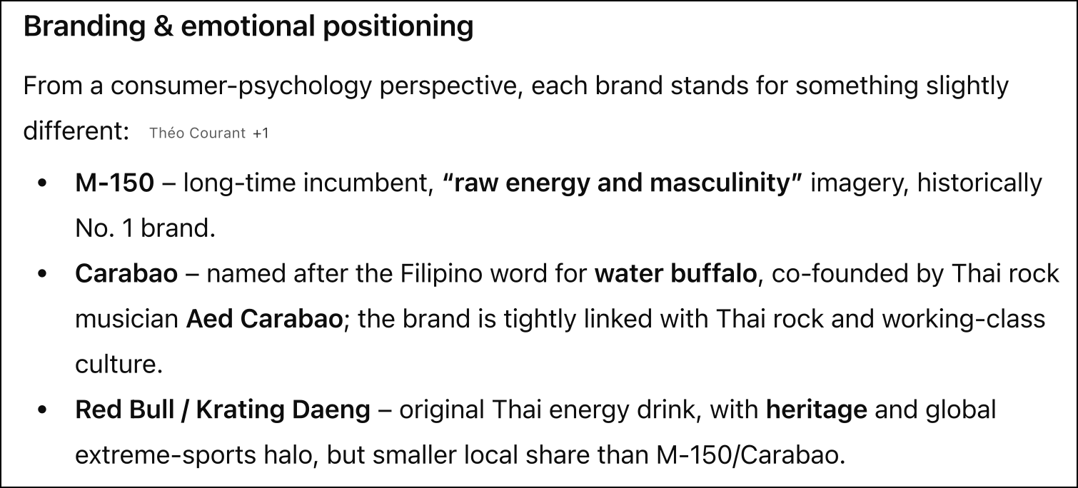 Gemini 3's answer has improved significantly from before, helping me understand the key differences between Carabao Dang and its competitors. Claude's answer has also improved a great deal, for example pointing out that Osotspa retook market share in 2025 thanks to its cheaper Yellow Cap variant. But overall, I'd say ChatGPT wins this one:
