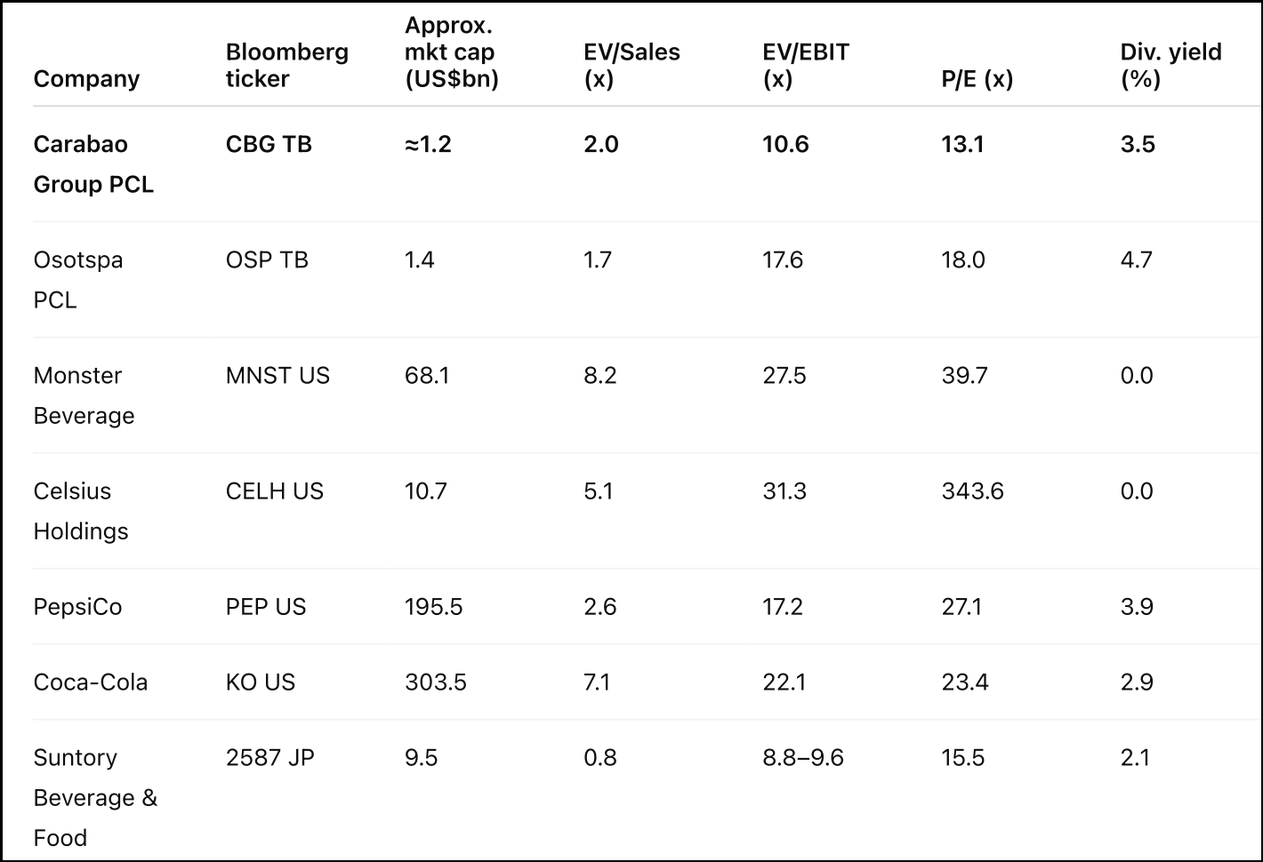 "Generative a comparables table with Carabao and its key global peers within the energy drinks industry. Include the Bloomberg ticker, USD market cap and the following valuation multiples: EV/Sales, EV/EBIT, P/E and dividend yield. Also include the 5-year average return on equity for each peer."