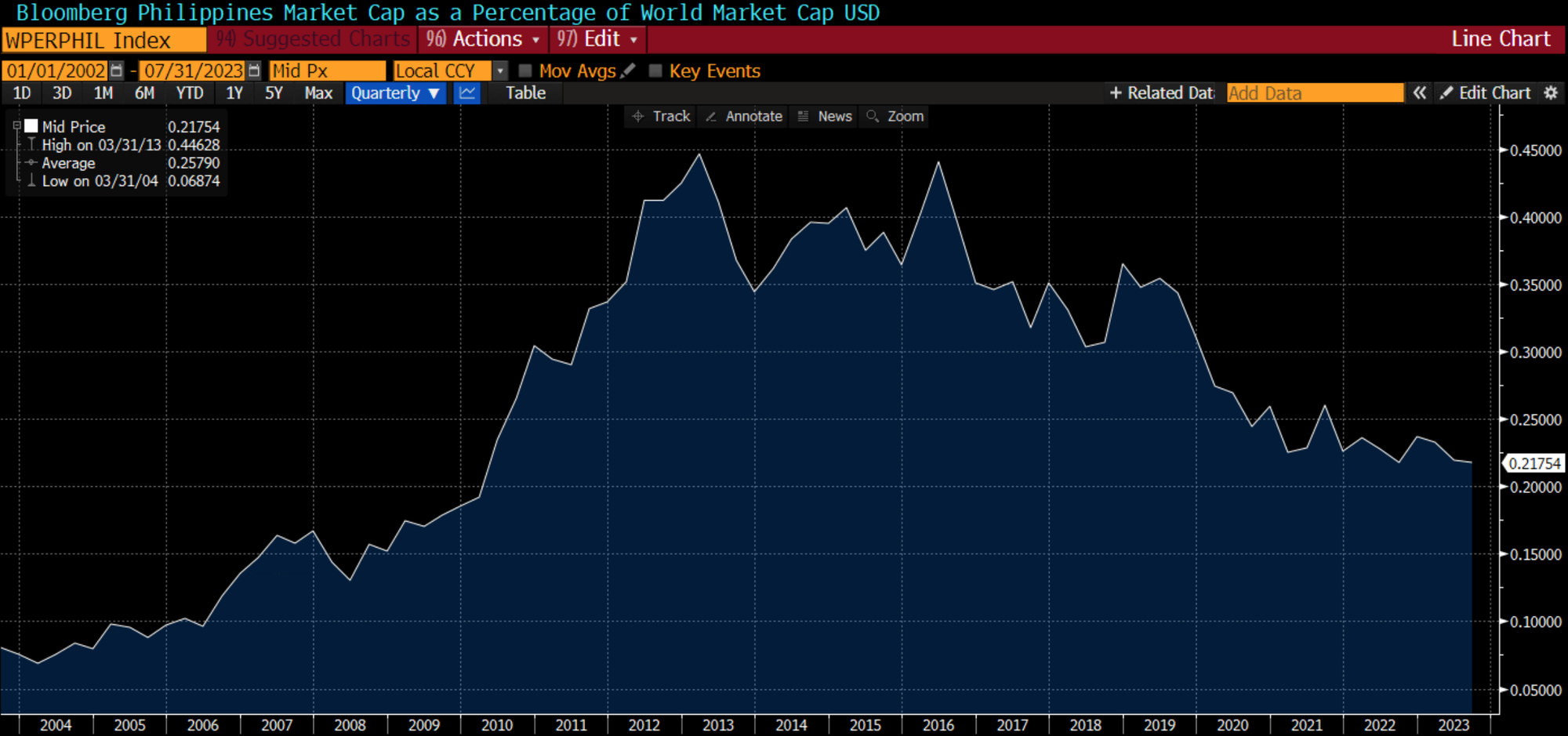 It’s also a fact that investors remain cautious about Philippine equities. The Price/Book ratio of the Philippine Stock Exchange Index (PSEi) is now close to its 2008 lows. And the total market cap of Philippine stocks as a percentage of the world market cap is also close to a 10-year low: