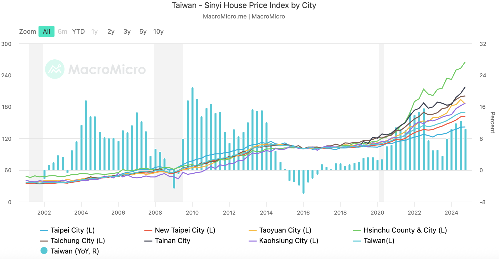 It’s also a fact that Taipei’s residential property prices are incredibly high. According to this website, the price/income ratio is 33x, meaning that it takes 33 years of saving all income to be able to buy a property if you’re single. The gross rental yield in the city center is less than 2%. And prices continue to go up across both Taipei and nearby cities such as Taoyuan and Hsinchu: