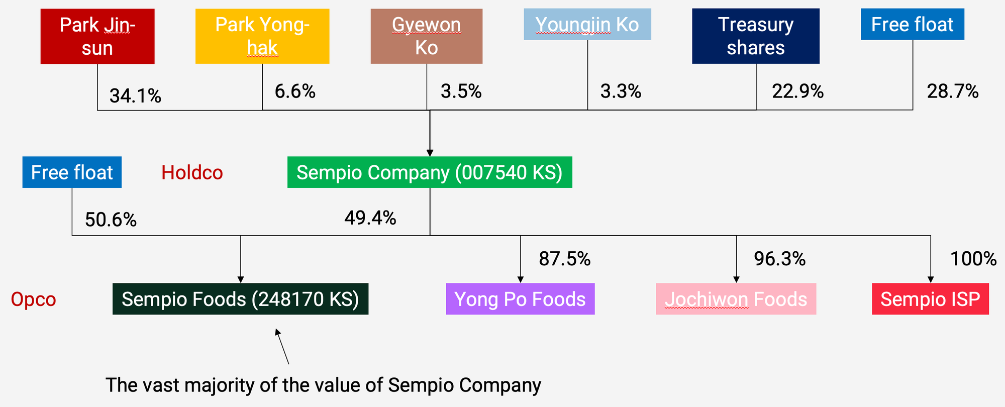For example, take the case of Sempio Foods, a company I wrote about a few years ago. It’s one of Korea’s largest manufacturers of soy sauce. Sempio Company, with ticker 007540 KS, is the holding company in the group, and Sempio Foods, with ticker 248170 KS, is the operating company. Through this structure, the Park family can assert control over the operating company. Meanwhile, the key brand names are all owned by the holding company, giving it bargaining power against minority shareholders in the operating company.