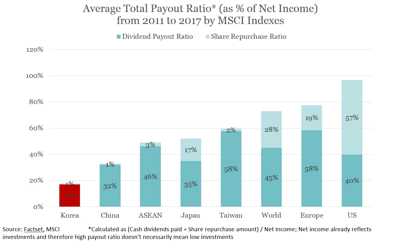 The following chart from Dalton Investments shows that Korea’s dividend payout ratio from 2011 to 2017 was just 17% vs 45% for the world as a whole: