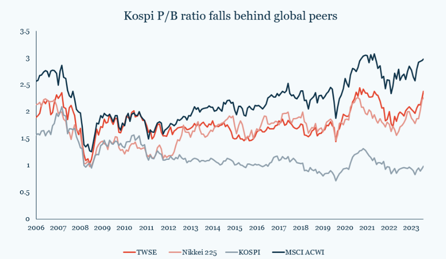 This discount has been around for decades, but it’s become even larger in the last few years. Today, South Korea’s benchmark KOSPI Index trades at just 1.0x book - way below Nikkei 225’s 2.1x book and the MSCI All Country World Index’s 3.0x book.