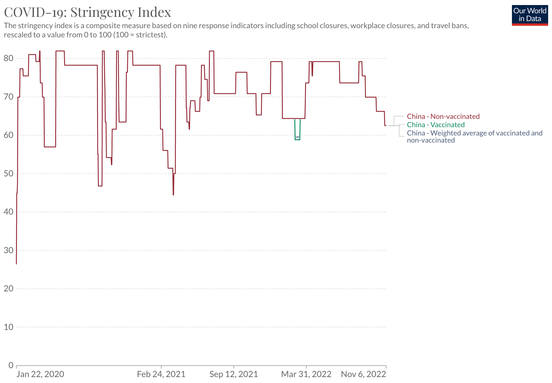 So the result of all of these above reforms is that China’s COVID-19 stringency index - which measures the severity of movement restrictions - has dropped steadily since October: